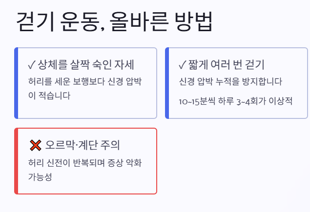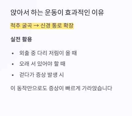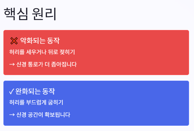👉 허리를 부드럽게 굽혀 신경 공간을 확보하는 동작은 증상을 완화합니다.