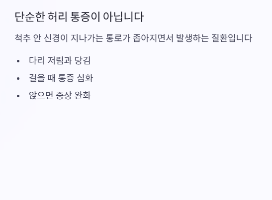 허리협착증 증상, 허리만 아픈 게 아니다허리가 아프기 시작하면 대부분 단순 근육통이라고 생각합니다.하지만 다리까지 저리거나, 오래 걷기 힘들어지고, 허리를 굽히면 괜찮아지는 느낌이 있