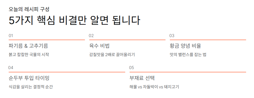 파기름으로 낸 고추기름과 액젓을 활용한 감칠맛 조절, 그리고 순두부를 마지막에 넣어 식감을 살리는 것이 황금레시피의 핵심입니다. 이 원칙들만 기억하신다면 오늘 저녁 여러분의 식탁 위에는 최고의 순두부찌개가 올라올 것입니다.