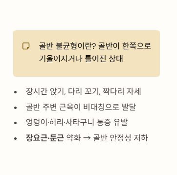 특히 장요근과 둔근이 약해지면 골반 안정성이 떨어져 통증이 반복됩니다.