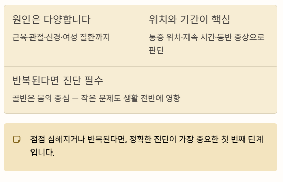 골반 통증은 단순 근육통에서부터 신경 압박, 여성 질환까지 원인이 다양합니다. 통증 위치와 지속 기간, 동반 증상을 기준으로 판단해야 합니다.