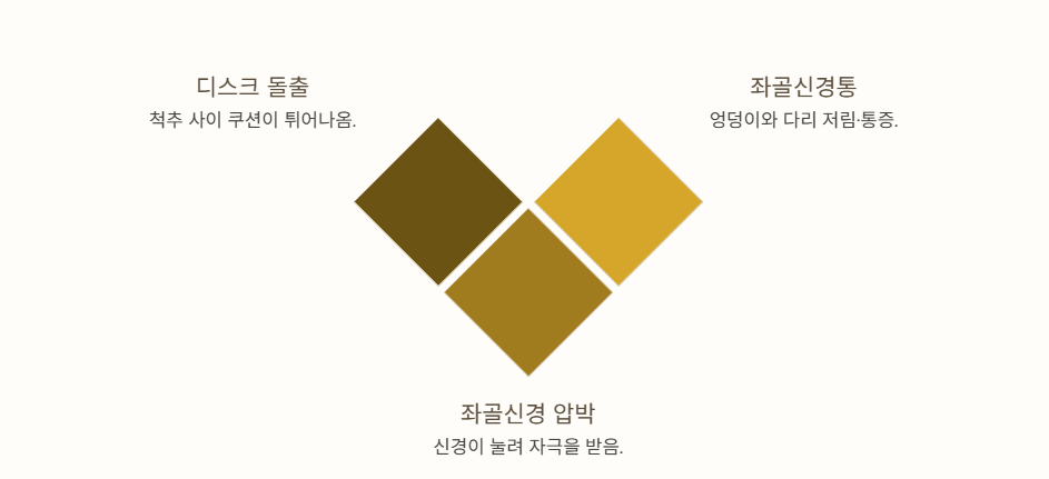 디스크가 튀어나오면 좌골신경을 압박해 엉덩이에서 다리까지 저림이나 통증이 이어질 수 있습니다. 이를 좌골신경통이라고 부릅니다.