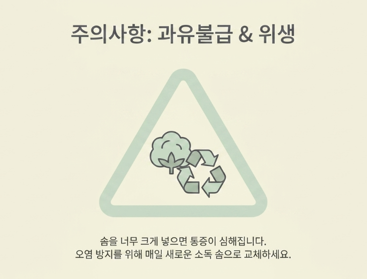 이 방법은 발톱이 살 위로 자라날 수 있는 '가이드 라인'을 만들어 주는 원리입니다. 주의할 점은 솜을 너무 크게 넣어 통증이 더 심해지게 해서는 안 된다는 것입니다. 또한, 오염된 솜은 염증의 원인이 되므로 매일 새로운 소독 솜으로 교체해 주어야 합니다. 며칠간 이 과정을 반복하면 발톱이 살 위로 올라오면서 신기할 정도로 통증이 사라지는 것을 경험할 수 있습니다.