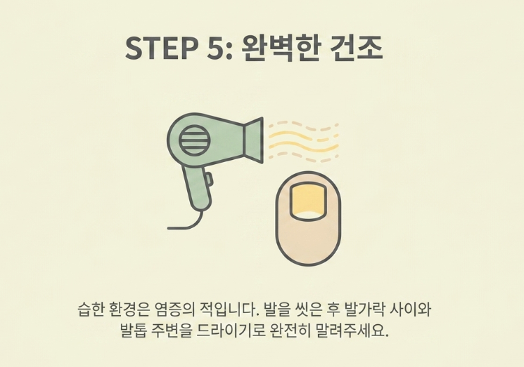 또한 발의 위생 관리도 철저히 해야 합니다. 발을 씻은 후에는 발가락 사이사이와 발톱 주변을 드라이기를 이용해 완전히 건조해 주세요. 습한 환경은 세균 번식을 도와 염증을 악화시킵니다. 만약 자가치료 중 주변이 빨갛게 부어오르고 고름이 나오거나, 열감이 느껴진다면 이는 세균 감염의 신호입니다. 이때는 지체하지 말고 피부과나 정형외과를 방문해 전문적인 치료를 받아야 골든타임을 놓치지 않습니다.