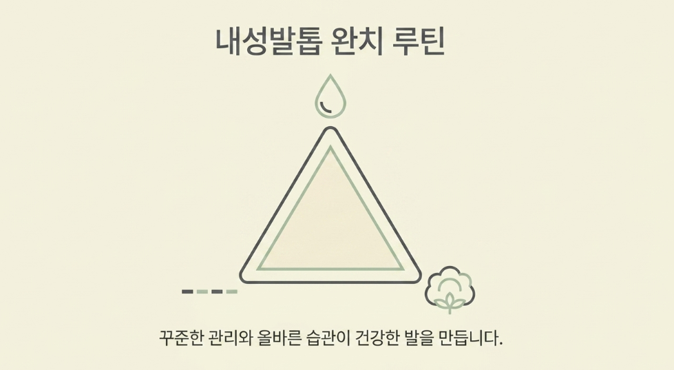 내성발톱 자가치료의 핵심은 족욕으로 발톱을 유연하게 만든 뒤 솜이나 치실로 공간을 확보하고, 반드시 일자로 깎는 습관을 들여 재발을 방지하는 것입니다. 꾸준한 관리와 올바른 습관만이 고통스러운 내성발톱으로부터 당신의 발을 건강하게 지켜줄 수 있습니다.