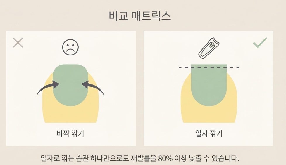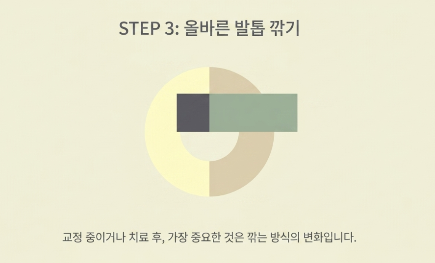 자가치료 중이거나 치료가 끝난 후 가장 중요한 예방법은 발톱을 깎는 방식의 변화입니다. 많은 사람이 깔끔해 보이기 위해 발톱의 양 끝을 둥글게 파내어 깎지만, 이는 내성발톱으로 가는 지름길입니다. 앞으로 발톱을 깎을 때는 반드시 일자 형태로 깎아야 합니다.