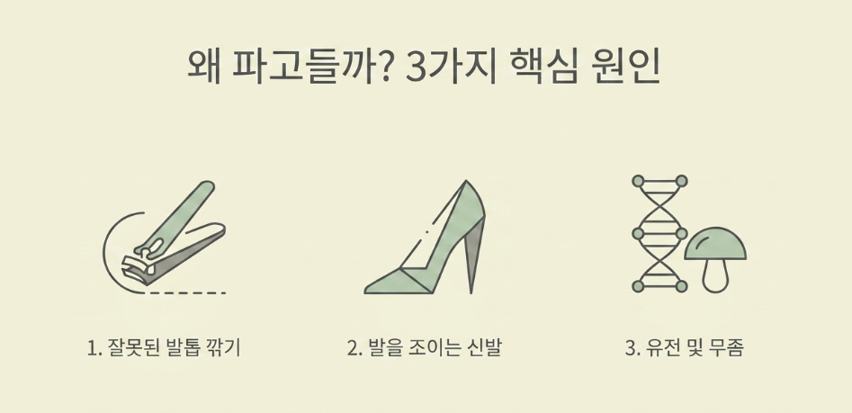 내성발톱(조갑감입)은 발톱이 살 속으로 파고들어 염증과 통증을 유발하는 질환입니다. 자가치료를 시작하기 전, 왜 이런 문제가 생겼는지 정확히 아는 것이 중요합니다. 가장 흔한 원인은 발톱을 너무 짧고 둥글게 깎는 습관입니다. 발톱 모서리를 바짝 깎으면 살이 발톱 자리를 치고 올라오며 길을 막게 되고, 결국 발톱이 살을 찌르게 됩니다.