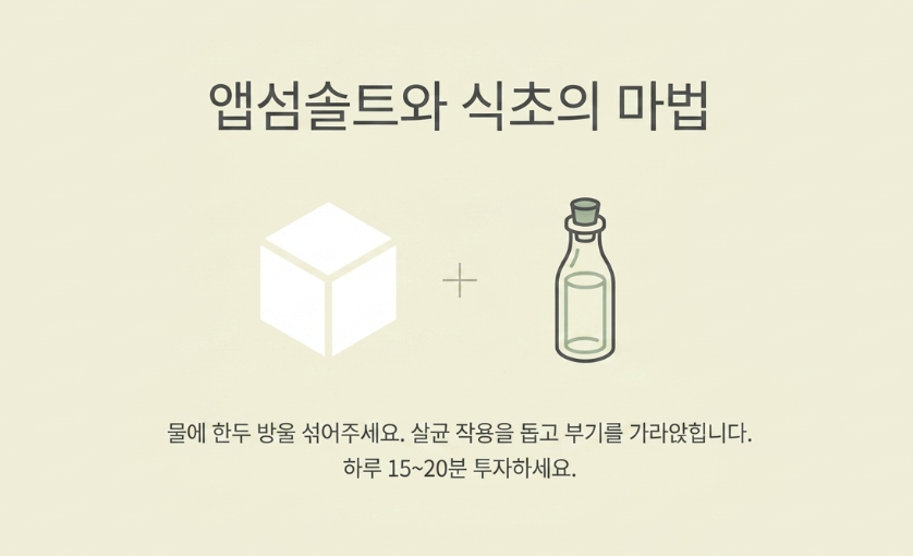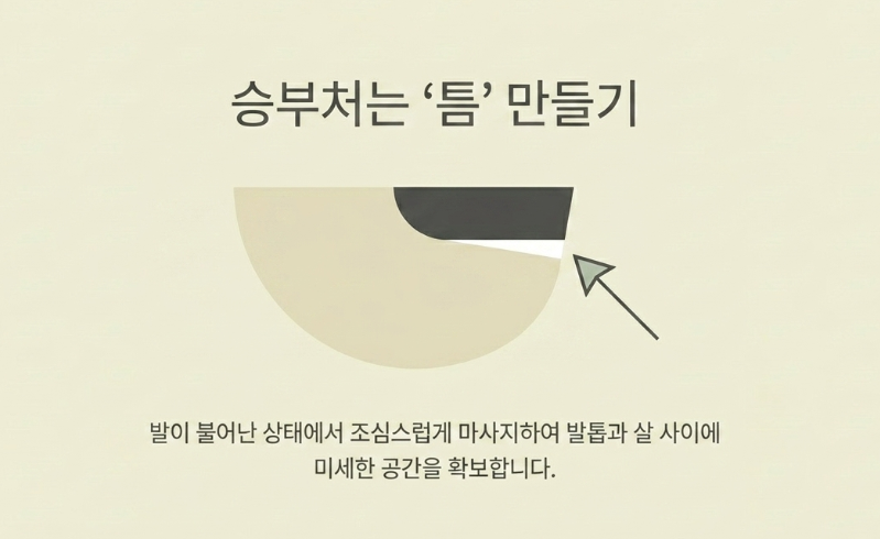 이때 일반 물보다는 에 Epsom salt(앱섬솔트)나 식초를 한두 방울 섞는 것이 좋습니다. 소금 성분은 살균 작용을 도와 염증 수치를 낮추고 부기를 가라앉히는 데 효과적입니다. 족욕 후 발이 충분히 불어난 상태에서 조심스럽게 발톱 주변을 마사지해 주면, 발톱과 살 사이에 미세한 틈이 생기기 시작합니다. 이 틈이 바로 자가치료의 승부처가 됩니다.