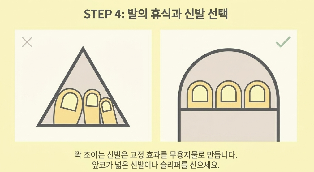 자가치료 기간에는 발에 가해지는 압력을 최소화해야 합니다. 아무리 좋은 교정법을 써도 발을 꽉 조이는 신발을 신으면 도루묵이 됩니다. 집안에서는 가급적 맨발로 생활하거나 통기성이 좋은 슬리퍼를 신으세요. 외출 시에도 앞코가 넓고 여유 있는 신발을 선택해 발가락이 자유롭게 움직일 수 있도록 해야 합니다.
