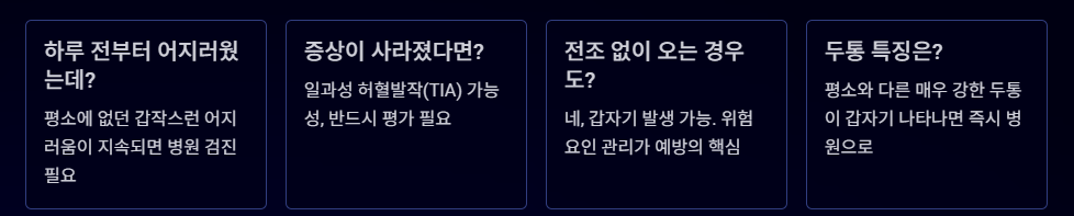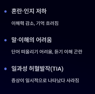 일시적으로 나타났다가 사라지는 증상도 일과성 허혈발작(TIA) 가능성이 있어 반드시 평가가 필요합니다.
