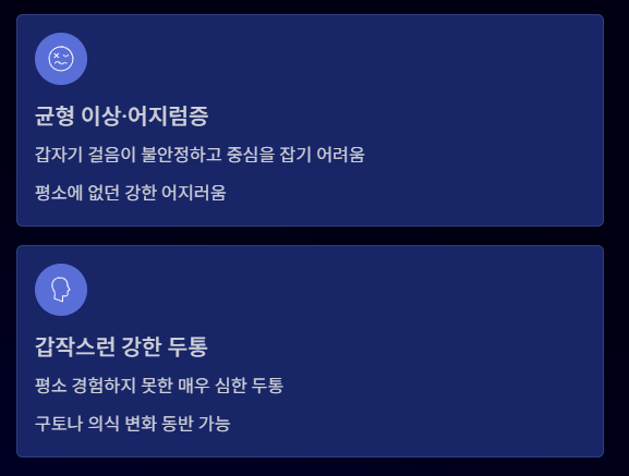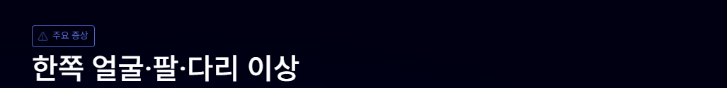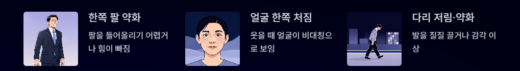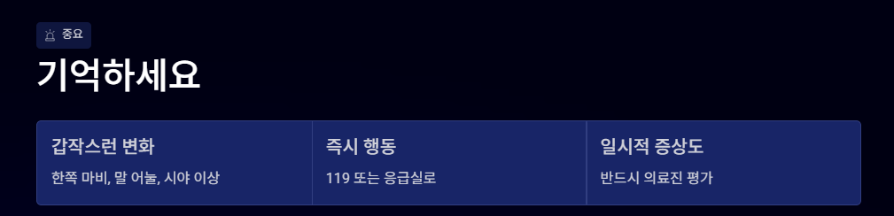 한쪽 마비·말 어눌·시야 이상·어지러움·강한 두통 등 갑작스런 신경학적 변화가 있다면