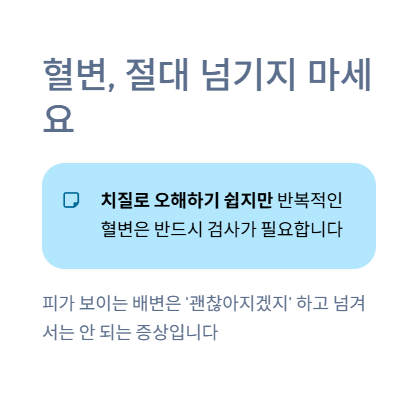 치질이나 항문 질환으로 오해하는 경우가 많지만, 반복적으로 혈변이 나타난다면 반드시 검사가 필요합니다.