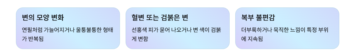 또한 변 표면이 울퉁불퉁해지거나, 이전과 다른 형태가 지속적으로 나타나는 것도 주의 깊게 살펴봐야 합니다.