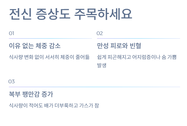 특히 배변 이상이나 피로감이 함께 동반된다면 단순 다이어트 효과로 오해하지 않는 것이 중요합니다.