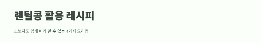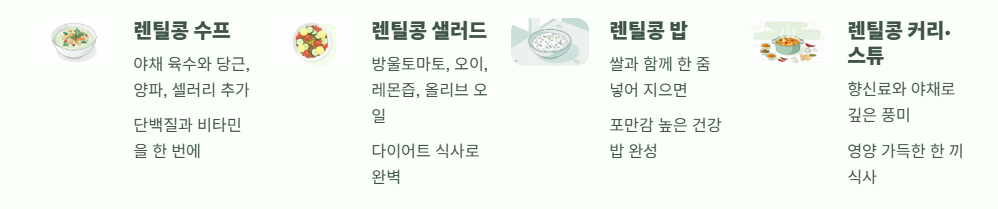 아래는 초보자도 따라 하기 쉬운 렌틸콩 활용 레시피들입니다.