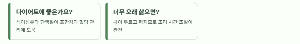 과도하게 삶으면 콩이 무르고 퍼질 수 있으므로 조리 시간을 조절하는 것이 관건입니다.