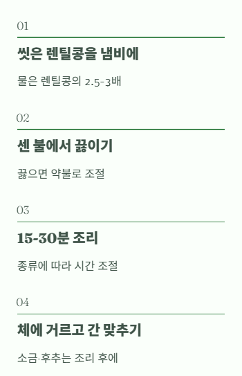 - 녹색/갈색 렌틸콩은 약 25~30분 정도 삶으면 좋습니다.