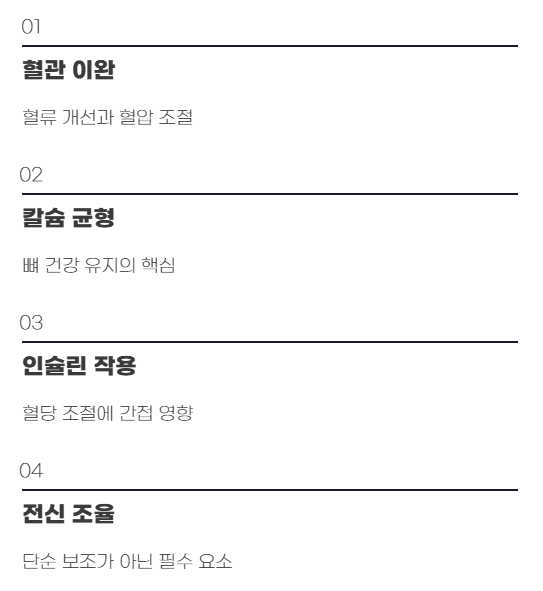 또한 칼슘과 균형을 이루어 뼈 건강을 지키는 데 중요한 역할을 하며, 인슐린 작용을 도와 혈당 조절에도 간접적으로 영향을 미칩니다. 단순 보조 성분이 아니라 전신 기능의 조율자에 가깝습니다.