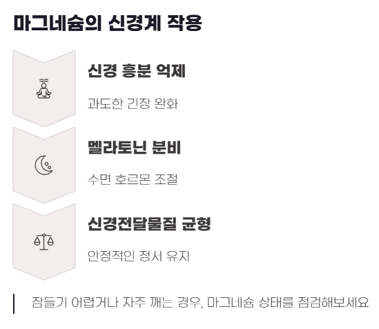 실제로 마그네슘은 멜라토닌 분비와 신경 전달 물질의 균형에 관여해 수면의 질 개선에도 긍정적인 영향을 줍니다. 잠들기 어렵거나 자주 깨는 경우, 마그네슘 상태를 점검해볼 필요가 있습니다.