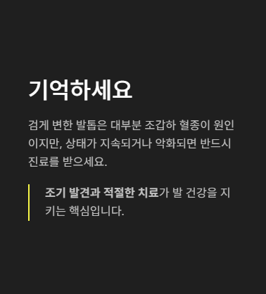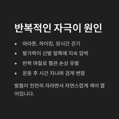 - 충격이 반복되면 발톱이 점점 더 검게 보이기도 함