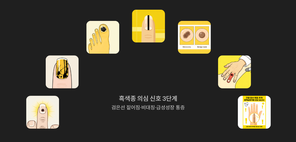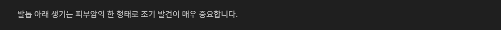 드물지만 발톱 아래에 생기는 피부암의 한 형태로 검은색 선·스팟이 점점 짙어지거나 퍼지는 경우에는 긴급 진료가 필요합니다.