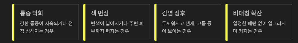 흑색종 같은 심각한 질환의 가능성도 있으므로 전문의 진료 권장합니다.
