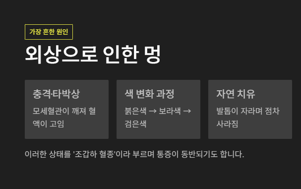 발톱이 검게 변하는 가장 흔한 경우는 외부 충격에 의한 멍(혈액이 고인 상태) 입니다. 특히 발을 세게 부딪히거나 꽉 끼는 신발을 오래 신는 경우에 자주 발생합니다.