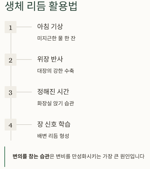 - 의견: 변의를 느꼈을 때 참는 습관은 변비를 만성화시키는 가장 큰 원인입니다. 장의 감각이 무뎌지기 전에 즉시 화장실로 가는 직관적인 반응을 회복해야 합니다.