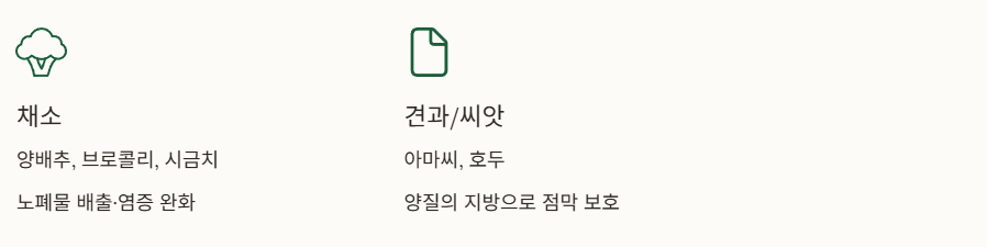| 채소 | 양배추, 브로콜리, 시금치 | 장내 노폐물 배출 및 염증 완화 |