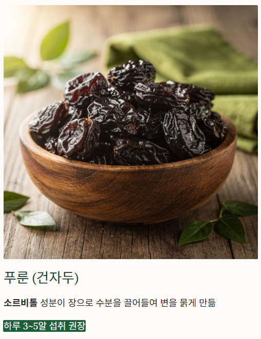 | 과일 | 사과, 키위, 푸룬, 무화과 | 펙틴과 소르비톨이 변을 부드럽게 함 |