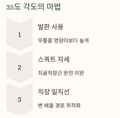 - 해결책: 화장실에서 배변 시 발아래에 낮은 발판(변비 스툴)을 두어 무릎이 엉덩이보다 높게 올라오도록 하세요. 약 35도 각도의 '스쿼트' 자세가 되면 직장이 일직선으로 펴지면서 변이 훨씬 쉽게 빠져나옵니다.