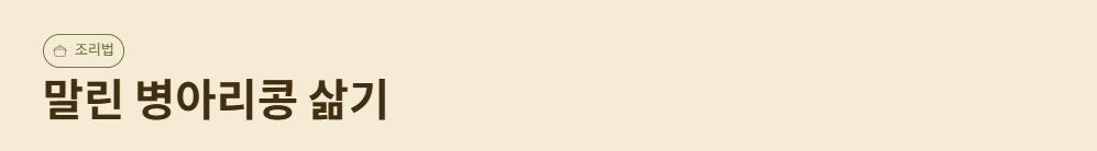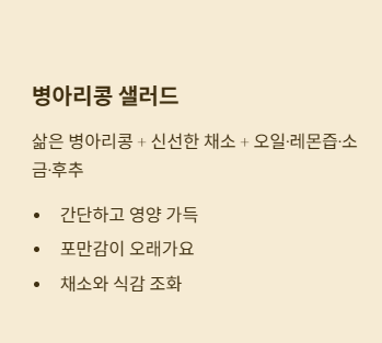 - 병아리콩 볶음: 병아리콩 + 올리브오일 + 소금 + 향신료