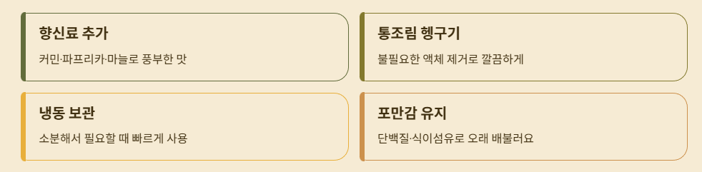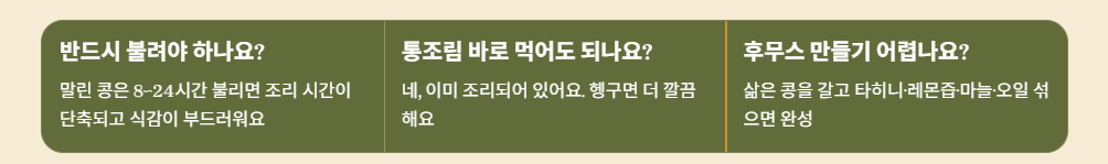 ✔ 불린 병아리콩을 조리 시 향신료(커민, 파프리카, 마늘) 를 추가하면 맛이 훨씬 풍부해집니다.