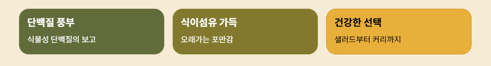✔ 병아리콩은 단백질과 식이섬유가 풍부하여 포만감을 오래 유지시키는 데 좋습니다.