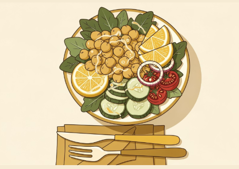 삶은 혹은 통조림 병아리콩을 신선한 채소와 함께 오일·레몬즙·소금·후추로 버무려 먹으면 간단하고 영양 가득한 한 끼가 됩니다.