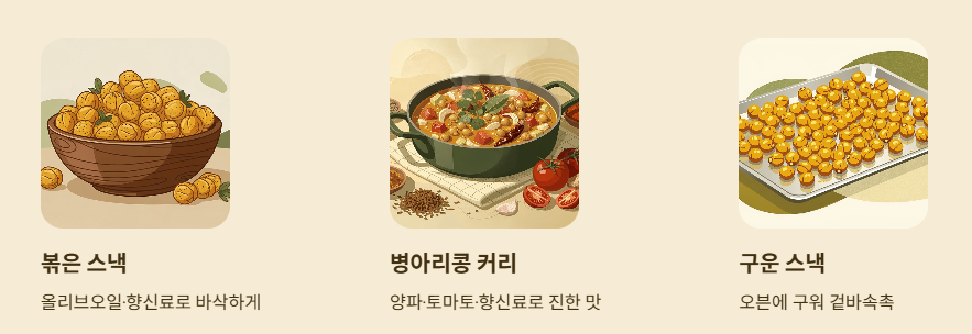 병아리콩은 단순히 삶아 먹는 것뿐 아니라 다양한 요리로 변신합니다.