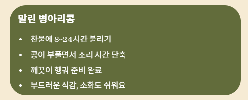 - 불리는 과정에서는 콩이 부풀고 조리 시간이 크게 단축됩니다.
