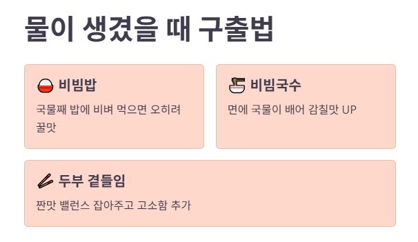 • 물이 생겼다 → 그건 이미 시작됨. 대신 비빔밥/비빔국수/두부 곁들임으로 용도 변경하면 맛이 살아나요.