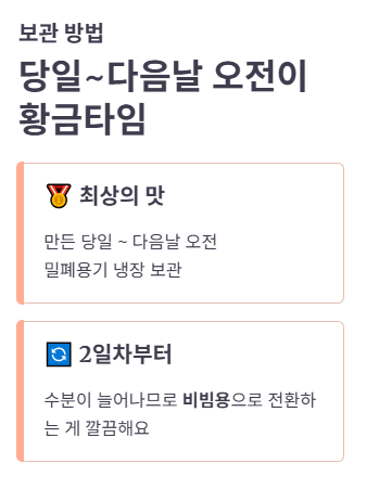 • 2일차부터는 수분이 늘 수 있으니 “비빔용”으로 전환하는 게 깔끔합니다.