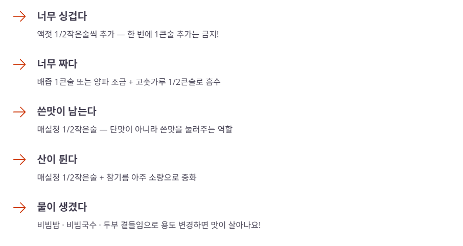• 너무 싱겁다 → 액젓 1/2작은술씩 추가(한 번에 1큰술 추가 금지)