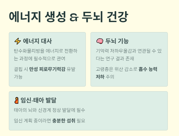 비타민 B12는 뇌 기능과도 밀접한 관련이 있습니다. 일부 연구에서는 결핍이 기억력 저하나 우울감과 연관될 수 있다고 보고합니다.