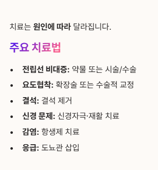 - 종양(전립선암·방광암 등): 드물지만 막힘을 유발합니다.