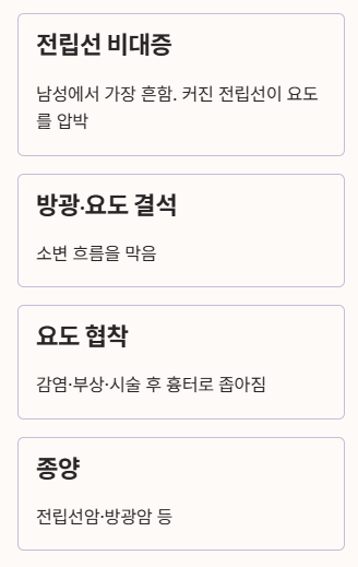 - 전립선 비대증: 약물(α 블로커나 5α-환원효소 억제제) 또는 시술/수술 치료