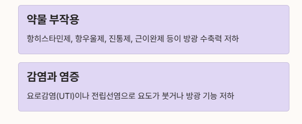 요로감염(UTI)이나 전립선염 등 염증이 생기면 요도가 붓거나 방광 기능이 저하되어 배뇨가 어려워질 수 있습니다.