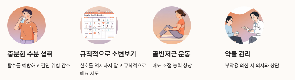 생활관리로는 규칙적으로 소변을 보기, 충분한 수분 섭취, 의사의 지시에 따른 약물 복용 등이 도움이 될 수 있습니다.