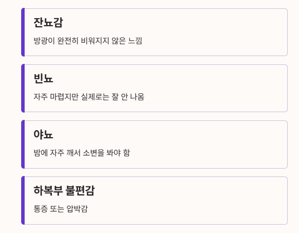 - 방광이 꽉 찬 느낌 또는 잔뇨감(완전히 비워지지 않은 느낌)