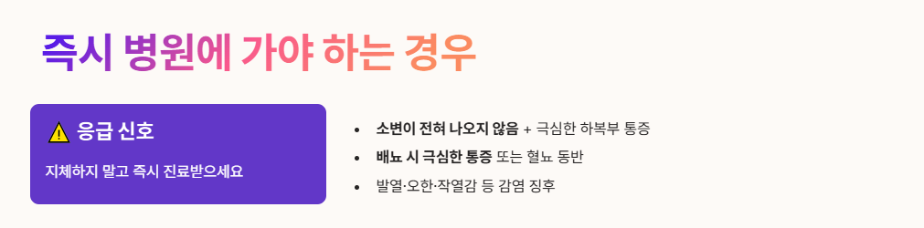 ✔ 소변이 전혀 나오지 않거나 극심한 하복부 통증이 있는 경우