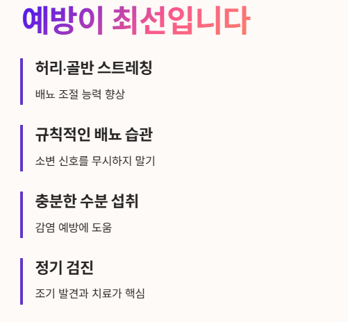 - 소변 신호를 억제하지 말고 규칙적으로 배뇨 시도