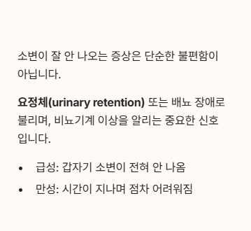 소변이 잘 안 나오거나 어려운 배뇨 경험은 단순한 불편함이 아니라 비뇨기계 이상 신호일 수 있습니다. 의료적으로는 요정체(urinary retention) 또는 요도 폐색·배뇨 장애로 구분하며, 증상과 원인은 다양합니다. 이 상태는 갑자기 전혀 소변이 안 나오는 급성과 시간이 지나면서 점차 어려워지는 만성으로 나뉩니다.