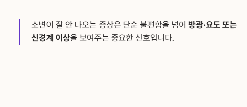소변이 잘 안 나오는 증상은 단순 불편함을 넘어 방광·요도 또는 신경계 이상을 보여주는 중요한 신호입니다. 급성일 경우 즉시 의료진 진료가 필요하며, 만성적인 경우라도 원인을 찾아 조기에 치료하는 것이 건강을 지키는 핵심입니다.